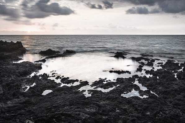 One of his new photographs, "Pool of Tranquility," depicts a multidimensional coastal scene incorporating intricate layers and textures: the shoreline's craggy igneous forms, the movement of the sea, the finality of the horizon's laser-line, and even the drama of the setting sun. All this movement and variation is balanced and ordered around the photograph's central image—the pool's bright, mysterious void. While contextually we know we are looking at a tidal pool, Pierson's treatment makes the pool feel otherworldly. The tonal and textural differences separate the pool from the movement of the ocean and even from the familiar stillness of smaller adjoining pools. In fact, the pool scarcely reads as water at all: It feels neither liquid nor solid. It feels simultaneously full and empty. A viewer may just as easily create a narrative in which the pool is a creative force out of which the rest of the scene has somehow emerged, or a destructive force in the process of erasing or consuming the landscape itself.